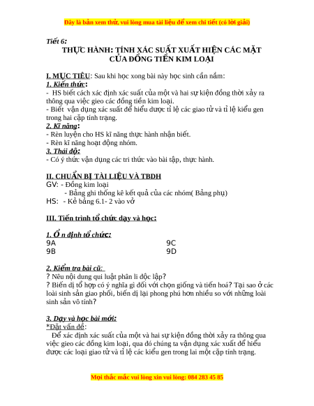 Giáo án Thực hành: Tính xác suất xuất hiện các mặt của đồng kim loại Sinh học 9