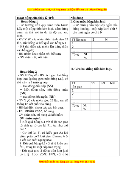 Đây là bản xem th , vu ử i lòng mua tài li u ệ đ xe ể m chi ti t (c ế ó l i ờ gi i ả ) Hoạt đ ng c ộ a t ủ hày & trò N i ộ dung Hoạt đ ng 1 ộ I. Gieo m t ộ đ ng ki ồ m lo i ạ : - GV hư ng ớ d n ẫ quy trình ti n ế hành: - GV hư ng d ớ ẫn m t ặ s p ấ ng a c ử a ủ Lấy m t ộ đ ng ồ ti n ề kim lo i ạ , cầm đ ng ứ đồng kim lo i ạ : m t ặ sấp là có ch S ữ c nh ạ và thả s i ơ tự do từ độ cao xác còn m t ặ ng a ử có ch N ữ định. - GV Y /C các nhóm ti n ế hành gieo 25 TT lần gieo S N lần, r i ồ thống kê k t ế quả vào b ng 6.1 ả 1 - HS đ i ạ di n ệ các nhóm lên b ng ả đi n ề 2 vào b ng ả phụ ........ - HS nhóm khác nh n xét ậ , bổ sung C ng ộ SL - GV nh n xét ậ , k t ế lu n ậ % II. Gieo hai đ ng t ồ i n k ề im lo i ạ . Hoạt đ ng 2 ộ - GV hư ng ớ d n ẫ HS cách gieo hai đ ng ồ kim lo i ạ (giống gieo m t ộ đ ng ồ KL), có th x ể y ả ra 3 trư ng ờ h p ợ : TT SS SN NN + Hai đồng đ u s ề ấp (SS) lần gieo + M t ộ đ ng ồ s p ấ , m t ộ đ ng ồ ng a ủ 1 (SN) 2 + Hai đồng đ u ng ề a ử (NN) 3