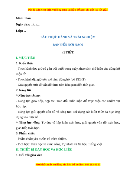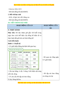 Đây là bản xem th , vu ử i lòng mua tài li u ệ đ xe ể m chi ti t (c ế ó l i ờ gi i ả ) - Giáo án, SGK, SGV. - Mô hình đồng hồ (b Đ ộ DHT) 2. Đ i ố v i ớ h c s ọ inh - SGK, v ghi ở , bút vi t ế , b ng con ả - Mô hình đồng hồ (b Đ ộ DHT) III. TI N Ế TRÌNH D Y Ạ H C Ọ HOẠT Đ N Ộ G C A Ủ GV HOẠT Đ N Ộ G C A Ủ HS A. TH C Ự HÀNH Mục tiêu: HS đ c ọ đư c ợ giờ g n ắ v i ớ bu i ổ trong ngày theo cách thể hi n ệ c a ủ đ ng ồ hồ đi n ệ tử và th c ự hành đ t ặ gi t ờ rên mô hình đ ng h ồ ồ Cách ti n hà ế nh: