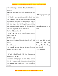 Bước 2: Ti n hà ế nh ch i ơ - GV tổ ch c ứ cho HS cả l p ớ ti n ế hành ch i ơ như hư ng ớ d n SG ẫ K B. C N Ủ G CỐ Mục tiêu: HS c ng ủ cố l i ạ m t ộ l n ầ n a ữ ki n ế th c ứ - HS xác đ nh ị các đ a ị đã h c ọ danh Hà N i ộ , H i ả Cách ti n hà ế nh: Phòng, Hu , ế Nha Trang - GV yêu c u ầ HS: Xác đ nh ị các đ a ị danh ở c t ộ N i ơ trên b n đ ả ồ đ n t ế rên b n ả đồ cuối sách. - HS l ng nghe ắ - GV gi i ớ thi u ệ đ t ấ nư c ớ Vi t ệ Nam c a ủ chúng ta, n i ơ nào cũng t oi ư đ p. ẹ Các em nên thư ng ờ xuyên tìm hi u ể nh ng ữ đi u ề thú vị ở các vùng mi n ề c a ủ đ t ấ nư c ớ (h i ỏ ngư i ờ l n, ớ xem sách báo, xem truy n ề hình, ...) và trao đ i ổ v i ớ các b n. ạ M i