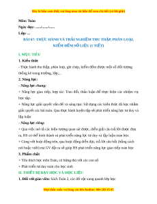 Ngày dạy: ....../......./...... L p: ớ ... BÀI 67: TH C Ự HÀNH VÀ TR I Ả NGHI M Ệ THU TH P Ậ , PHÂN LO I Ạ , KIỂM ĐẾM S L Ố IỆU (1 TIẾT) I. M C Ụ TIÊU 1. Ki n t ế h c ứ - Th c hành t ự hu th p, ậ phân lo i ạ , ghi chép, ki m ể đ m ế đư c m ợ t ộ s đ ố i ố tư ng ợ thống kê trong trư ng, l ờ p,... ớ 2. Năng l c: ự - Năng l c ự chung: + Năng l c ự giao ti p, ế h p ợ tác: Trao đ i ổ , th o ả lu n ậ để th c ự hi n ệ các nhi m ệ vụ h c ọ t p. ậ + Năng l c ự gi i ả quy t ế v n ấ đ ề và sáng t o: ạ S ử d ng ụ các ki n ế th c ứ đã h c ọ nh m ằ gi i ả quy t