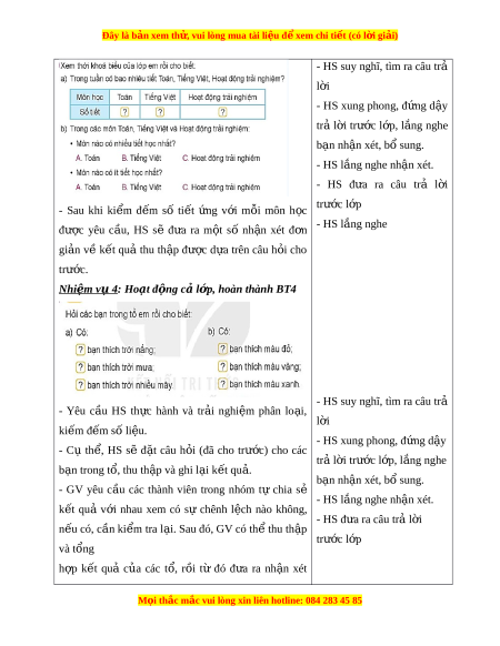 - HS suy nghĩ, tìm ra câu trả l i ờ - HS xung phong, đ ng ứ d y ậ trả l i ờ trư c ớ l p, ớ l ng ắ nghe b n nh ạ n ậ xét, bổ sung. - HS l ng ắ nghe nh n xét ậ . - HS đ a ư ra câu trả l i ờ - Sau khi ki m ể đ m ế số ti t ế ng ứ v i ớ m i ỗ môn h c ọ trư c ớ l p ớ đư c ợ yêu c u, ầ HS sẽ đ a ư ra m t ộ số nh n ậ xét đ n ơ - HS l ng ắ nghe gi n ả về k t ế quả thu th p ậ đư c ợ d a ự trên câu h i ỏ cho trư c. ớ Nhi m ệ v 4 ụ : Ho t ạ đ ng ộ c l ả p, hoàn t ớ hành BT4