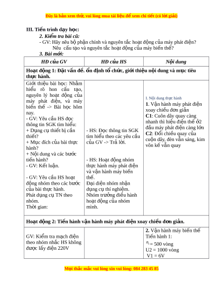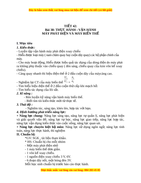 Đây là bản xem th , vu ử i lòng mua tài li u ệ đ xe ể m chi ti t (c ế ó l i ờ gi i ả ) TIẾT 42: Bài 38: TH C Ự HÀNH : V N Ậ HÀNH MÁY PHÁT ĐI N Ệ VÀ MÁY BI N Ế THẾ I. M c t ụ iêu 1. Ki n ế th c: ứ - Luyện t p ậ v n hành m ậ áy phát đi n xoay chi ệ u ề - Hi u ể đư c ợ lo i