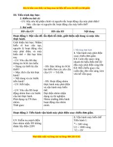 cu n dây, đèn v n sáng, kim ế ẫ hành? vôn k v n quay + N i ộ dung và các bư c ớ ti n hành? ế - HS: Ho t ạ đ ng nhóm ộ - GV: K t ế lu n. ậ th c hành m ự áy phát đi n ệ và v n hành ậ máy bi n ế - GV: Yêu c u H ầ S ho t ạ th . ế đ ng ộ nhóm theo các bư c ớ Đ i ạ di n nhóm ệ nh n ậ c a ủ bài th c hành. ự d ng c ụ t ụ hí nghi m ệ . Phát d ng c ụ ụ TN theo Nhóm trư ng ở đi u hành ề nhóm. ho t ạ đ ng c ộ a ủ nhóm Th i ờ gian: mình. Hoạt đ ng 2 ộ : Ti n hành v ế n hành m ậ