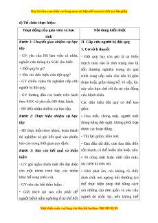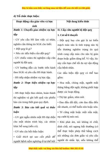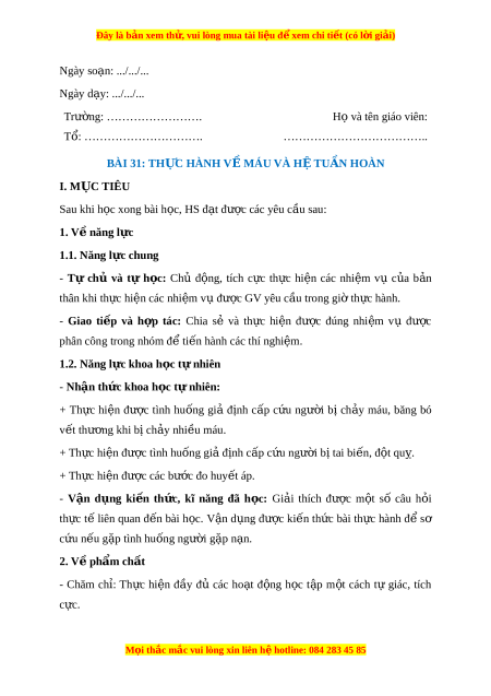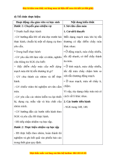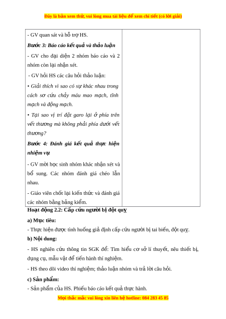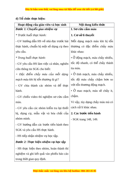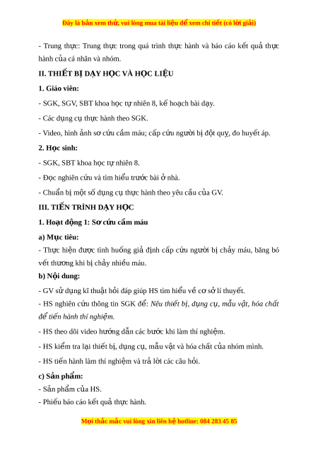 Đây là bản xem th , vu ử i lòng mua tài li u ệ đ xe ể m chi ti t ế (có l i ờ gi i ả ) - Trung th c: ự Trung th c ự trong quá trình th c ự hành và báo cáo k t ế quả th c ự hành c a ủ cá nhân và nhóm. II. THIẾT B D Ị ẠY H C Ọ VÀ H C Ọ LI U Ệ 1. Giáo viên: - SGK, SGV, SBT khoa h c ọ t nhi ự ên 8, k ho ế ch ạ bài d y ạ . - Các d ng c ụ t ụ h c hành ự theo SGK. - Video, hình nh ả s c ơ u ứ c m ầ máu; c p c ấ u ứ ngư i ờ b đ ị t ộ qu , đo huy ỵ t ế áp. 2. H c ọ sinh: - SGK, SBT khoa h c ọ t nhi ự ên 8. - Đ c nghi ọ ên c u ứ và tìm hi u t ể rư c ớ bài nhà. ở - Chuẩn b m ị t ộ số d ng c ụ ụ th c ự hành theo yêu c u c ầ a ủ GV. III. TI N Ế TRÌNH D Y Ạ H C Ọ 1. Hoạt đ ng 1 ộ : Sơ cứu cầm máu a) M c t ụ iêu: - Th c ự hi n ệ đư c ợ tình hu ng ố giả đ nh ị c p ấ c u ứ ngư i ờ bị ch y ả máu, băng bó v t ế thư ng ơ khi b ch ị y nhi ả u m ề áu. b) N i ộ dung: - GV s d ử ng kĩ ụ thu t ậ h i ỏ đáp giúp HS tìm hi u ể v c ề s ơ l ở í thuy t ế . - HS nghiên c u ứ thông tin SGK đ : ể Nêu thi t ế b ,ị d ng ụ c , ụ m u ẫ v t ậ , hóa ch t ấ đ t ể i n hành t ế hí nghi m ệ . - HS theo dõi video hư ng d ớ n các ẫ bư c khi ớ làm thí nghi m ệ . - HS ki m ể tra l i ạ thi t ế b , d ị ng ụ c , m ụ u v ẫ t ậ và hóa ch t ấ c a ủ nhóm mình. - HS ti n hành l ế àm thí nghi m ệ và tr l ả i ờ các câu h i ỏ . c) S n ph ả m ẩ : - S n ph ả ẩm c a H ủ S. - Phi u báo cáo k ế t ế quả th c hành. ự M i ọ thắc m c