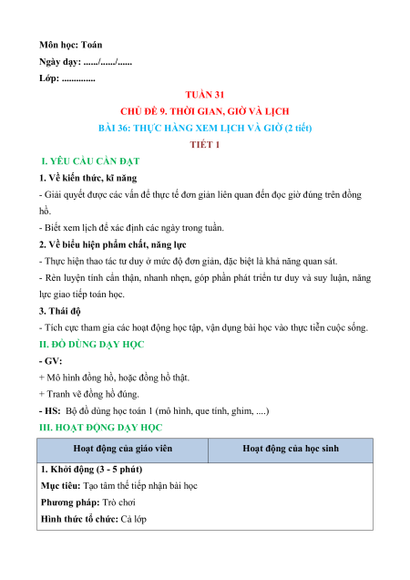 BÀI 36: THỰC HÀNG XEM LỊCH VÀ GIỜ (2 tiết) TIẾT 1 I. YÊU CẦU CẦN ĐẠT
