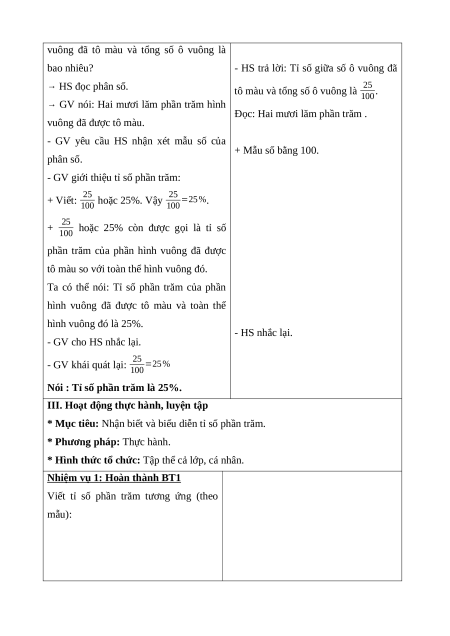 → GV nói: Hai mươi lăm phần trăm hình Đọc: Hai mươi lăm phần trăm . vuông đã được tô màu.