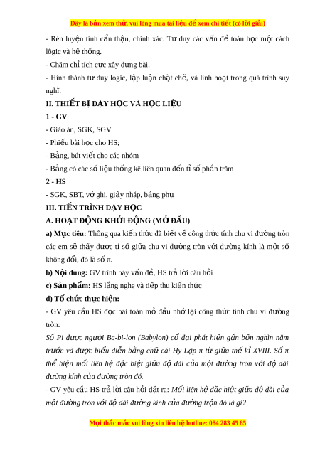 ữ thế kỉ XVIII. Số π thể hi n ệ m i ố liên hệ đ c ặ bi t ệ gi a ữ độ dài c a ủ m t ộ đư ng ờ tròn v i ớ độ dài đư ng kí ờ nh c a ủ đư ng t ờ ròn đó. - GV yêu c u ầ HS trả l i ờ câu h i ỏ đ t ặ ra: M i ố liên hệ đ c ặ hi t ệ gi a ữ đ ộ dài c a ủ m t ộ đư ng t ờ ròn v i ớ đ dài ộ đư ng ờ kính c a đ ủ ư ng ờ tr n đó l ộ à gì? M i ọ thắc m c