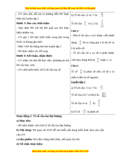 ậ xét thái độ làm vi c, ệ phư ng ơ án trả vi t ế theo đúng th t ứ ự a ho c a ặ : b. b l i ờ c a h ủ c ọ sinh. Chú ý: - GV chốt ki n t ế h c ứ v t ề ỉ số c a ủ hai số Tỉ số a là phân số n u ế cả tử a và b mẫu b đ u ề là số nguyên. Luy n t ệ ập 1 a) T s ỉ ố c a ủ -5 và -7 là: −5 −7 Tỉ số c a ủ 23,7 23,7 và 89,6 là: 89,6 4 Tỉ số c a ủ 3 4 và là: 3 7 7