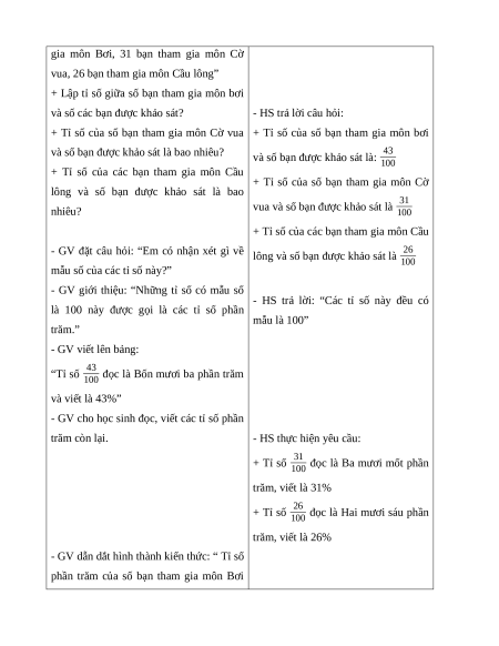 - Nhận biết được tỉ số và tỉ số phần trăm của hai số. * Cách tiến hành: