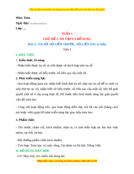 Ủ Ề 1. ÔN TẬP VÀ B SU Ổ NG BÀI 2: TIA S . S Ố L Ố IỀN TRƯ C Ớ , S L Ố I N Ề SAU (2 ti t ế ) Ti t ế 1 I. M C Ụ TIÊU 1. Ki n t ế h c, kĩ ứ năng: - Nh n bi ậ t ế được tia s và vi ố t ế đư c ợ s t ố hích h p t ợ rên tia s . ổ - Nh n bi ậ t ế được số li n t ể rư c, s ớ l ố i n s ề au c a ủ m t ộ s . ố 2. Phát tri n nă ể ng l c: ự - Qua ho t ạ đ ng ộ quan sát, nh n ậ bi t ế hình nh ả tia s , ố d a ự vào tia s đ ố s ể o sánh và x p ế thứ tự các s , ố nh n ậ bi t ế số li n ề trư c, ớ s ố li n ề sau c a ủ m t ộ s ; ố liên h ệ gi i ả quy t ế m t ộ số ví dụ trong th c ự t , ế HS bư c ớ đ u ầ hình thành năng l c ự gi i ả quy t ế vấn đ t ề oán h c. ọ - Cùng v i ớ ho t ạ đ ng ộ trên, qua ho t ạ đ ng ộ di n ễ đ t ạ , trả l i ở câu h i ỏ (b ng ằ cách nói ho c ặ vi t