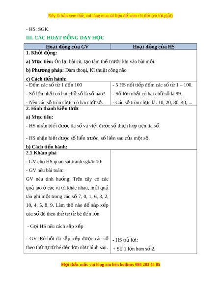 ọ thắc mắc vui lòng xin liên hotline: 084 283 45 85 Đây là bản xem th , vui ử lòng mua tài li u ệ đ xe ể m chi ti t ế (có l i ờ gi i ả ) - HS: SGK. III. CÁC HO T Ạ Đ N Ộ G D Y Ạ H C Ọ Hoạt đ ng c ộ a G ủ V Hoạt đ ng c ộ a H ủ S 1. Kh i ở đ ng: ộ a) M c t ụ iêu: Ôn l i ạ bài cũ, t o t ạ âm th t ế rư c ớ khi vào bài m i ớ . b) Phư ng pháp ơ : Đàm tho i ạ , Kĩ thu t ậ công não c) Cách ti n h ế ành: - Đ m ế các số t 1 đ ừ n 100 ế - 5 HS n i ố ti p đ ế m ế các s t ố 1 – 100. ừ - Số l n ớ nh t ấ có hai chữ s l ố à s nào? ố - Số l n ớ nh t ấ có hai chữ s l ố à 99. - Nêu các số tròn ch c ụ có hai ch s ữ . ố - Các số tròn ch c ụ là: 10, 20, 30, 40, ... 2. Hình thành ki n t ế h c ứ a) M c t ụ iêu: - HS nh n bi ậ t ế đư c ợ tia s và vi ố t ế đư c ợ s t ố hích h p t ợ rên tia s . ổ - HS nh n bi ậ t ế đư c ợ s l ố i n t ể rư c, s ớ l ố i n s ề au c a m ủ t ộ s . ố b) Cách ti n hành ế : 2.1 Khám phá