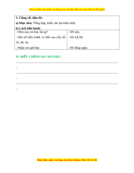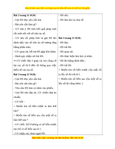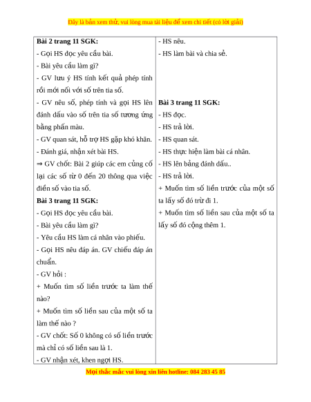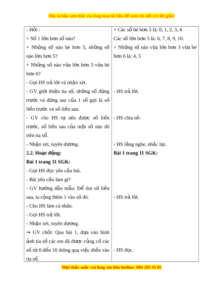 ọ thắc mắc vui lòng xin liên hotline: 084 283 45 85 Đây là bản xem th , vui ử lòng mua tài li u ệ đ xe ể m chi ti t ế (có l i ờ gi i ả ) - H i ỏ : + Các s bé h ố n ơ 5 là: 0, 1, 2, 3, 4 + Số 1 l n h ớ n s ơ ố nào? Các số l n h ớ n ơ 5 là: 6, 7, 8, 9, 10. + Nh ng ữ số nào bé h n ơ 5, nh ng ữ số + Nh ng ữ số nào v a ừ l n ớ h n ơ 3 v a ừ bé nào l n ớ h n 5? ơ h n ơ 6 là: 4, 5 + Nh ng ữ số nào v a ừ l n ớ h n ơ 3 v a ừ bé h n ơ 6? - G i ọ HS tr l ả i ờ và nh n ậ xét. - GV gi i ớ thi u ệ tia s , ố nh ng ữ số đ ng ứ - HS trả l i ờ . trư c ớ và đ ng ứ sau c a ủ 1 số g i ọ là số li n t ề rư c và ớ s l ố i n s ề au. - GV cho HS tự nêu đư c ợ số li n ề - HS chia s : ẻ trư c, ớ số li n ề sau c a ủ m t ộ số nào đó trên tia sổ. - Nh n xét ậ , tuyên dư ng. ơ - HS l ng nghe, nh ắ ắc l i ạ . 2.2. Hoạt đ ng ộ : Bài 1 trang 11 SGK: Bài 1 trang 11 SGK: - G i ọ HS đ c yêu ọ c u bài ầ . - Bài yêu c u l ầ àm gì? - GV hư ng ớ d n ẫ m u: ẫ Để tìm số li n ề sau, ta c ng t ộ hêm 1 vào s đó. ố - HS trả l i ờ . - Cho HS làm cá nhân. - G i ọ HS tr l ả i ờ . - Nh n xét ậ , tuyên dư ng. ơ ⇒ GV ch t ố : Qua bài 1, d a ự vào hình nh