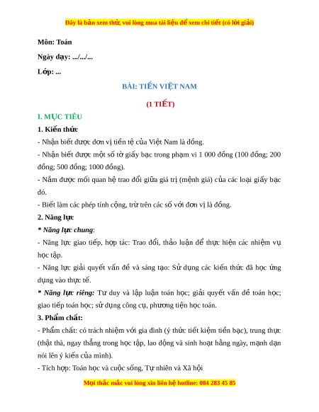 Ngày dạy: .../.../... L p: ớ ... BÀI: TIỀN VI T Ệ NAM (1 TIẾT) I. M C Ụ TIÊU 1. Ki n t ế h c ứ - Nh n bi ậ t ế được đ n v ơ t ị i n t ề c ệ a ủ Vi t ệ Nam là đ ng. ồ - Nh n ậ bi t ế đư c ợ m t ộ số t ờ gi y ấ b c ạ trong ph m ạ vi 1 000 đ ng ồ (100 đ ng ồ ; 200