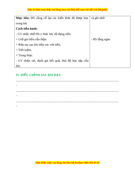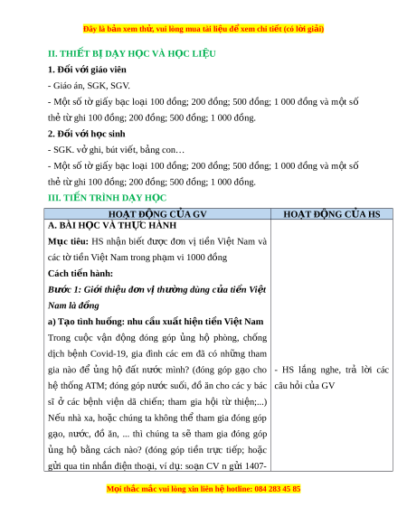Đây là bản xem th , vu ử i lòng mua tài li u ệ đ xe ể m chi ti t (c ế ó l i ờ gi i ả ) II. THIẾT B D Ị ẠY H C Ọ VÀ H C Ọ LI U Ệ 1. Đ i ố v i ớ giáo viên - Giáo án, SGK, SGV. - M t ộ số tờ gi y ấ b c ạ lo i ạ 100 đ ng; ồ 200 đ ng; ồ 500 đ ng; ồ 1 000 đ ng ồ và m t ộ số thẻ t ghi ừ