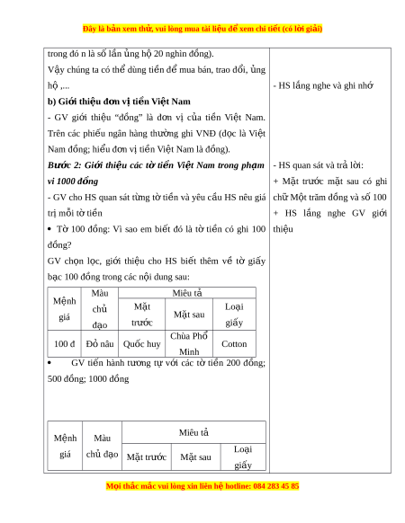 Đây là bản xem th , vu ử i lòng mua tài li u ệ đ xe ể m chi ti t (c ế ó l i ờ gi i ả ) trong đó n là số l n ầ ng h ủ 20 nghì ộ n đ ng ồ ). V y ậ chúng ta có th ể dùng ti n ề đ ể mua bán, trao đ i ổ , ng ủ hộ ,... - HS l ng ắ nghe và ghi nhớ b) Gi i ớ thi u đ ệ n v ơ t ị i n ề Vi t ệ Nam - GV gi i ớ thi u ệ “đ ng” ồ là đ n ơ vị c a ủ ti n ề Vi t ệ Nam. Trên các phi u ế ngân hàng thư ng ờ ghi VNĐ (đ c ọ là Vi t ệ Nam đồng; hi u đ ể n v ơ ị ti n ề Vi t ệ Nam là đ ng ồ ). Bước 2: Gi i ớ thi u