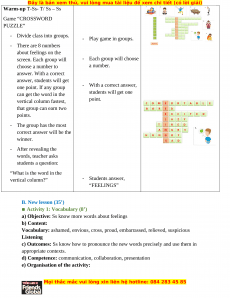 Warm-up T-Ss- T/ Ss – Ss Game “CROSSWORD PUZZLE” - Divide class into groups. - Play game in groups. - There are 8 numbers about feelings on the screen. Each group will - Each group will choose choose a number to a number. answer. With a correct answer, students will get one point. If any group - With a correct answer, can get the word in the students will get one vertical column fastest, point. that group can earn two points. - The group has the most correct answer will be the winner. - After revealing the words, teacher asks students a question: “What is the word in the vertical column?” - Students answer, “FEELINGS” B. New lesson (35’)