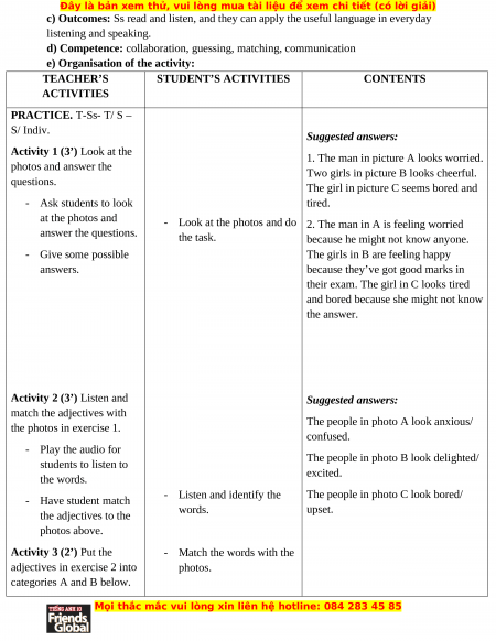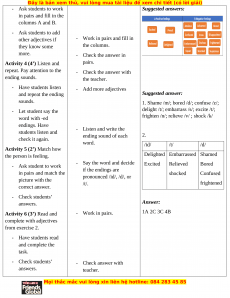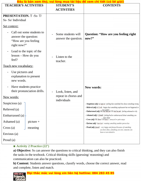 answer the question. now?” “How are you feeling right now?” - Lead to the topic of the lesson – How do you - Listen to the feel? teacher. Teach new vocabulary: - Use pictures and explanation to present new words. - Have students practice New words: their pronunciation drills. - Look, listen, and New words: repeat in chorus and individuals Suspicious (a) Relieved (a) Embarrassed (a) Ashamed (a) picture + Cross (a) meaning Envious (a) Proud (a)