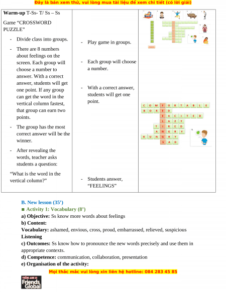 Warm-up T-Ss- T/ Ss – Ss Game “CROSSWORD PUZZLE” - Divide class into groups. - Play game in groups. - There are 8 numbers about feelings on the screen. Each group will - Each group will choose choose a number to a number. answer. With a correct answer, students will get one point. If any group - With a correct answer, can get the word in the students will get one vertical column fastest, point. that group can earn two points. - The group has the most correct answer will be the winner. - After revealing the words, teacher asks students a question: “What is the word in the vertical column?” - Students answer, “FEELINGS” B. New lesson (35’)