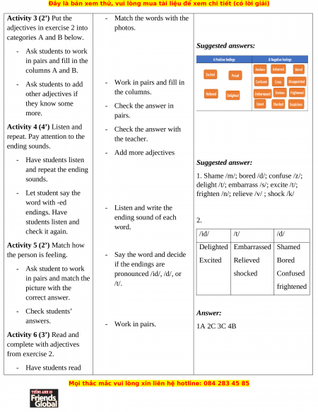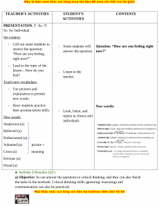 answer the question. now?” “How are you feeling right now?” - Lead to the topic of the lesson – How do you - Listen to the feel? teacher. Teach new vocabulary: - Use pictures and explanation to present new words. - Have students practice New words: their pronunciation drills. - Look, listen, and New words: repeat in chorus and individuals Suspicious (a) Relieved (a) Embarrassed (a) Ashamed (a) picture + Cross (a) meaning Envious (a) Proud (a)