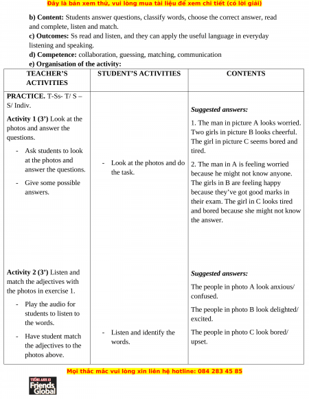 b) Content: Students answer questions, classify words, choose the correct answer, read