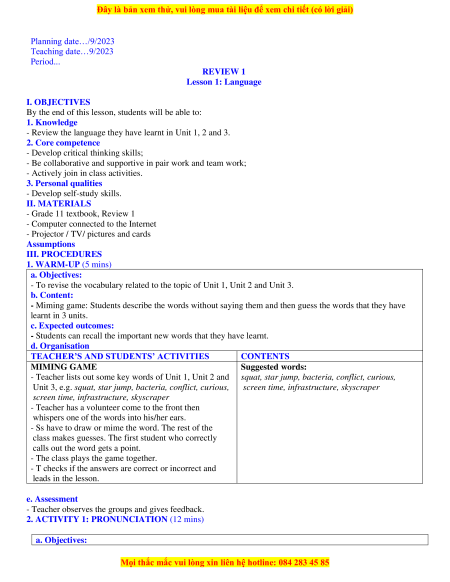 - Miming game: Students describe the words without saying them and then guess the words that they have learnt in 3 units. c. Expected outcomes: