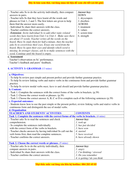- Task 3. Choose the correct answer A, B, C or D to complete each of the following sentences (p.39) c. Expected outcomes: