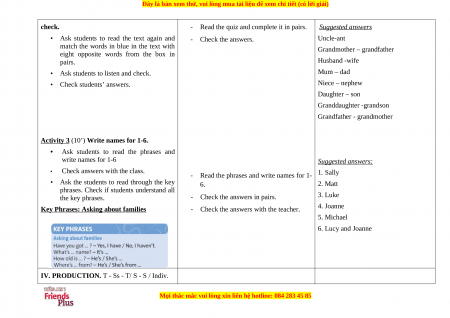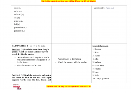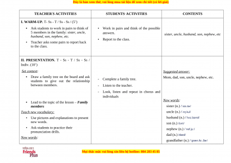 - Vocabulary: (n) sister, uncle, husband, son, nephew, dad, grandfather, grandson