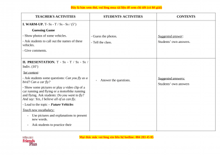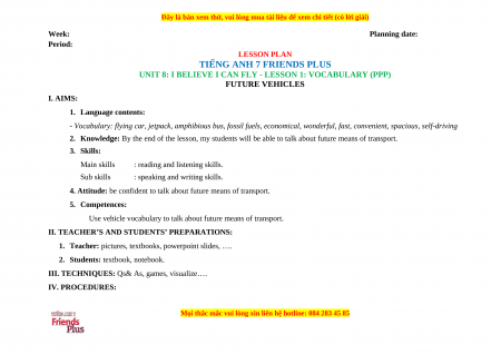 UNIT 8: I BELIEVE I CAN FLY - LESSON 1: VOCABULARY (PPP) FUTURE VEHICLES I. AIMS: 1. Language contents: