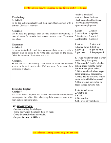 may ask some Ss to write their answers on the board. T corrects 5. fascinating 6. excited as a class. 7. affordable 8. interest Grammar 1. set up 2. deal with Activity 5: 3. turned down 4. look up