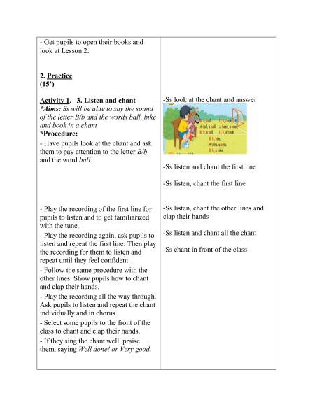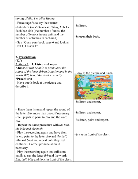 - Students: Textbooks, notebooks, workbooks, school things. D. PROCEDURES: Teacher’s activities Students’ activities 1.Warm- up: (5’) Mostly in Vietnamese