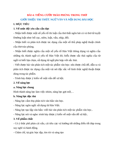 Ờ TRÀO PHÚNG TRONG THƠ GIỚI THI U Ệ TRI TH C Ứ NG Ữ VĂN VÀ N I Ộ DUNG BÀI H C Ọ I. M C Ụ TIÊU 1. V m ề ức đ / ộ yêu c u c ầ n đ ầ t ạ - Nh n ậ bi t ế đư c ợ m t ộ số y u ế tố thi lu t ậ c a ủ th ơ th t ấ ngôn bát cú và th t ơ t ứ uy t ệ Đư ng ờ lu t ậ nh : ư b c ố c, ni ụ êm, lu t ậ , v n, nh ầ p, đ ị i ố . - Nh n ậ bi t ế và phân tích đư c ợ tác d ng ụ c a ủ m t