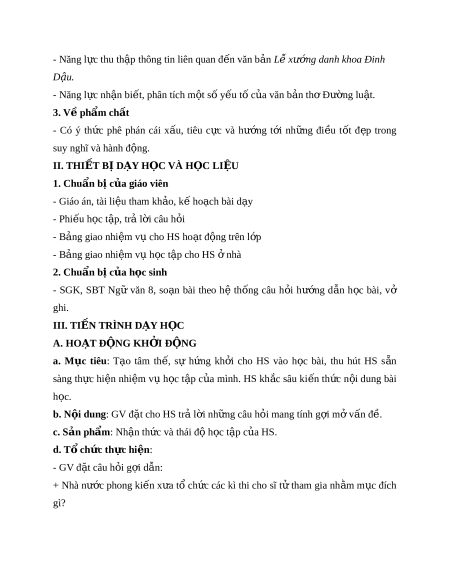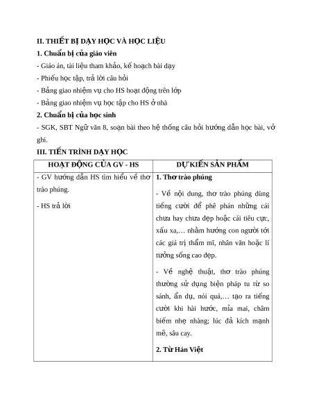 ộ số thủ pháp nghệ thu t ậ chính c a ủ th t ơ rào phúng. - Nh n ậ bi t ế đư c ợ nghĩa c a ủ m t ộ số y u ế tố Hán Vi t ệ thông d ng ụ và nghĩa c a ủ nh ng ữ t , ừ thành ngữ có y u ế tố Hán Vi t ệ đó; hi u ể đư c ợ s c ắ thái nghĩa c a ủ từ ng và ữ bi t ế l a ch ự n, s ọ ử d ng t ụ ng ừ phù h ữ p ợ v i ớ s c ắ thái. - Vi t ế đư c ợ bài văn phân tích m t ộ tác ph m ẩ văn h c: ọ nêu đư c ợ ch đ ủ , ề d n r ẫ a và phân tích đư c ợ tác d ng ụ c a ủ m t ộ vài nét đ c ặ s c ắ v ề hình th c ứ ngh ệ thu t ậ đư c ợ dùng trong tác ph m ẩ . - Trình bày đư c ý ki ợ n v ế m ề t ộ vấn đ xã ề h i ộ . 2. V năng l ề c ự a. Năng l c chung ự Hình thành năng l c l ự àm vi c nhóm ệ , năng l c g ự i ợ m ,… ở b. Năng l c đ ự c ặ thù - Năng l c c ự m ả th phân t ụ ích văn b n ả văn h c. ọ - Năng l c ngôn ng ự : ữ s d ử ng t ụ H ừ án Vi t ệ . - Năng l c t ự o ạ l p văn b ậ n: ả vi t ế bài văn phân tích m t ộ tác ph m ẩ văn h c.. ọ - Năng l c nói ự và nghe: trình bày đư c ợ ý ki n v ế m ề t ộ v n đ ấ xã h ề i ộ .. 3. V ph ề ẩm ch t ấ - Có ý th c ứ phê phán cái x u, ấ cái tiêu c c ự và hư ng ớ t i ớ nh ng ữ đi u ề t t ố đ p ẹ trong suy nghĩ và hành đ ng. ộ - Chăm ch , t ỉ gi ự ác h c t ọ p, t ậ ìm tòi và sáng t o ạ II. THIẾT B D Ị ẠY H C Ọ VÀ H C Ọ LI U Ệ 1. Chuẩn b c ị a g ủ iáo viên - Giáo án, tài li u t ệ ham kh o, k ả ế ho ch bài ạ d y ạ - Phi u h ế c t ọ p, ậ trả l i ờ câu h i ỏ - B ng ả giao nhi m ệ v cho H ụ S ho t ạ đ ng t ộ rên l p ớ - B ng ả giao nhi m ệ v h ụ c t ọ p ậ cho HS nhà ở 2. Chuẩn b c ị a h ủ c s ọ inh - SGK, SBT Ngữ văn 8, so n ạ bài theo hệ th ng ố câu h i ỏ hư ng ớ d n ẫ h c ọ bài, vở ghi. III. TI N Ế TRÌNH D Y Ạ H C Ọ HOẠT Đ N Ộ G C A Ủ GV - HS D K Ự IẾN SẢN PH M Ẩ - GV hư ng ớ d n ẫ HS tìm hi u
