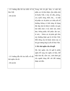 ế nhẹ nhàng; lúc đả kích m nh ạ mẽ, sâu cay. 2. Từ Hán Vi t ệ - GV hư ng ớ d n ẫ HS tìm hi u ể về từ Trong v n ố từ g c ố Hán, có m t ộ bộ Hán Vi t ệ ph n ậ các từ đ n ơ đư c ợ c m ả nh n ậ như từ thu n ầ Vi t ệ , ví d : ụ tổ, đ u, ầ phòng, - HS trả l i ờ cao, tuy t ế , bang, th n, ầ bút,… và m t ộ bộ ph n ậ các từ ph c ứ (có ch a ứ y u ế tố thư ng
