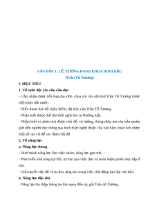 Ớ G DANH KHOA ĐINH D U Ậ (Trần T X ế ư ng) ơ I. M C Ụ TIÊU 1. V m ề ức đ / ộ yêu c u c ầ n đ ầ t ạ - C m ả nh n ậ đư c ợ n i ỗ lòng đau đ n, ớ chua xót c a ủ nhà th ơ Tr n ầ T ế Xư ng ơ trư c ớ hiện th c đ ự ất nư c. ớ - Hi u đ ể ư c ợ thái đ châm ộ bi m ế , đ kí ả ch c a ủ Tr n ầ T X ế ư ng. ơ - Nh n bi ậ t ế được th t ể h t ơ h t ấ ngôn bát cú Đư ng ờ lu t ậ . - Nh n ậ bi t ế và phân tích đư c ợ chủ đ , ề tư tư ng, ở thông đi p ệ mà văn b n ả mu n ố g i ử đ n ế ngư i ờ đ c ọ thông qua hình th c ứ ngh ệ thu t ậ c a ủ văn b n; ả phân tích đư c ợ m t ộ số căn c đ ứ xác ể định chủ đ . ề 2. V năng l ề c ự a. Năng l c chung ự - Hình thành năng l c l ự àm vi c nhóm ệ , năng l c ự g i ợ m ,… ở - Phát tri n ể khả năng t ự ch , ủ t ự h c ọ qua vi c ệ đ c ọ và hoàn thi n ệ phi u ế h c ọ t p ậ ở nhà. - Gi i ả quy t ế v n đ ấ và t ề ư duy sáng t o ạ trong vi c ch ệ đ ủ ng ộ t o l ạ p văn ậ b n. ả b. Năng l c đ ự c ặ thù - Năng l c t ự hu th p