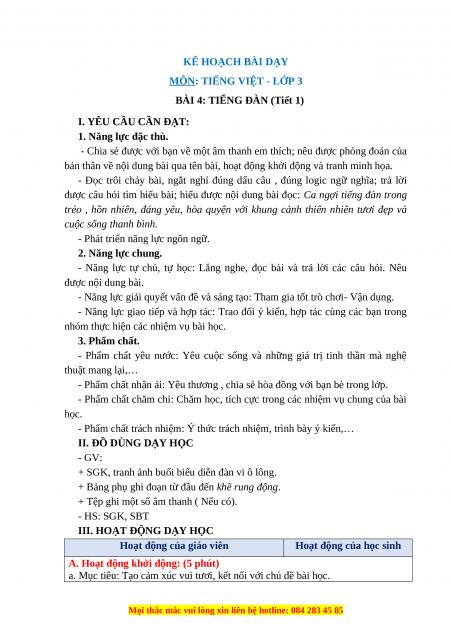 BÀI 4: TIẾNG ĐÀN (Tiết 1) I. YÊU CẦU CẦN ĐẠT: 1. Năng lực đặc thù.