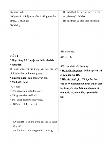 HS nhận diện chi tiết trong bài thơ, liên kết * Dự kiến sản phẩm: Phần đọc và trả
