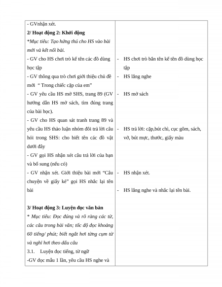 Giáo án Tiếng việt 1 Chân trời sáng tạo Trong chiếc cặp của em