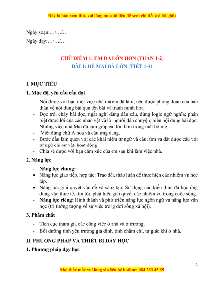 BÀI 1: BÉ MAI ĐÃ LỚN (TIẾT 1-4) I. MỤC TIÊU