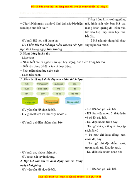 + Nhận biết các từ ngữ chỉ sự vật, hoạt động, đặc điểm trong bài thơ.
