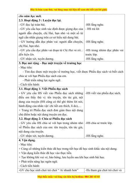 - HS: mang theo sách có truyện về trường học và Phiếu đọc sách đã ghi chép về truyện đã đọc.