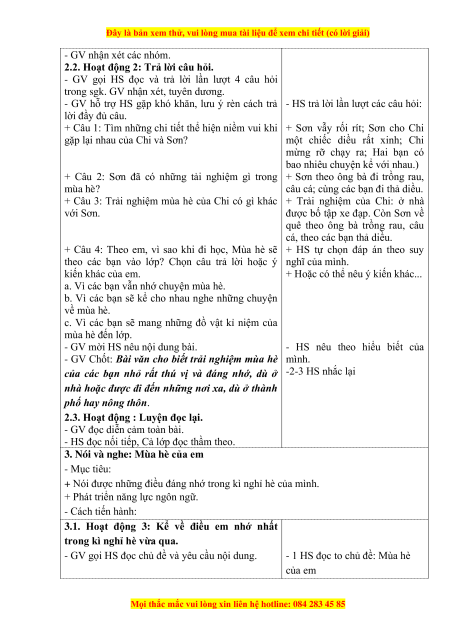 3. Nói và nghe: Mùa hè của em - Mục tiêu: