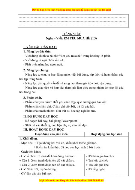 - Viết đúng chính tả bài thơ “Em yêu mùa hè” trong khoảng 15 phút.