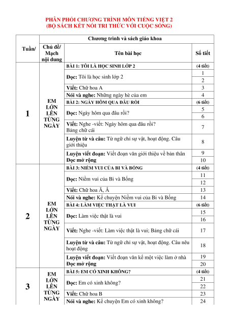 PHÂN PHỐI CHƯƠNG TRÌNH MÔN TIẾNG VIỆT 2
