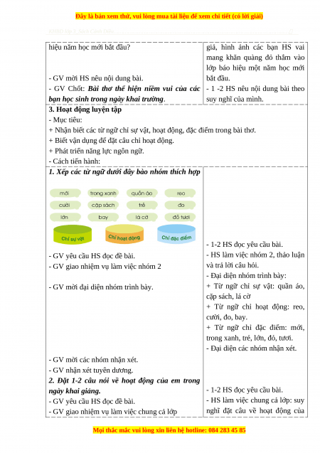 + Nhận biết các từ ngữ chỉ sự vật, hoạt động, đặc điểm trong bài thơ.
