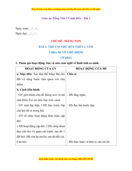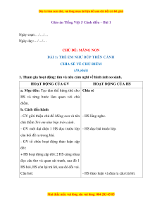 Giáo án Tiếng Việt 5 Cánh diều – Bài 1 Ngày soạn:…/…/… Ngày dạy:…/…/… CHỦ ĐỀ: MĂNG NON