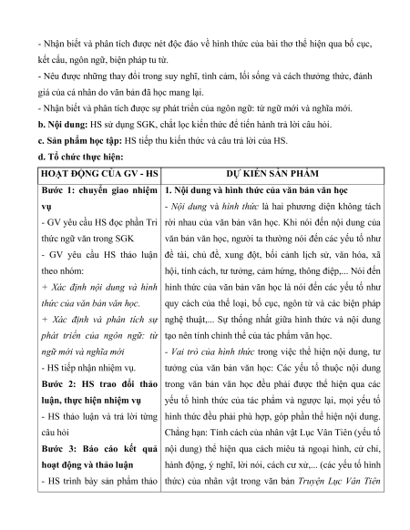 - Nhận biết và phân tích được mối quan hệ giữa nội dung và hình thức của văn bản văn học.