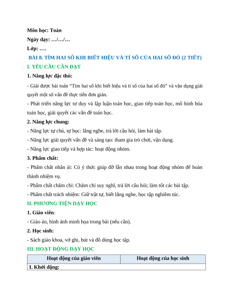 Giáo án Tìm hai số khi biết hiệu và tỉ số của hai số đó Toán lớp 5 Cánh diều
