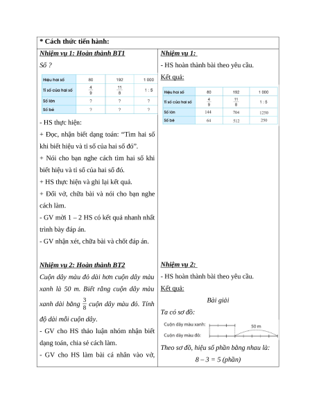 - Biết cách giải bài toán tìm hai số khi biết tổng và tỉ số của hai số đó. * Cách tiến hành: