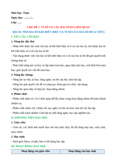 BÀI 39. TÌM HAI SỐ KHI BIẾT HIỆU VÀ TỈ SỐ CỦA HAI SỐ ĐÓ (2 TIẾT)